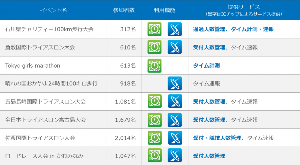 ウォーキングイベント、マラソン大会、トライアスロンなど各種イベントの人数管理・タイム計測に採用されました。 ※2016年末時点